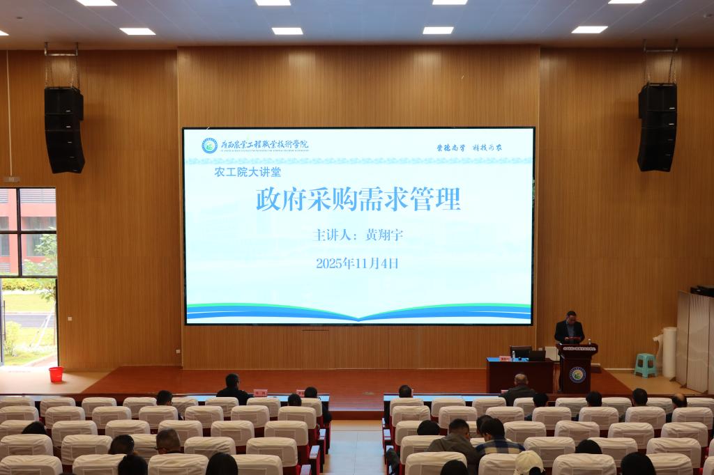 11月4日🚭,第三十四期“农工院大讲堂”开讲,广西政府采购中心(公共资源交易中心)评标科、内审科科长黄翔宇以“政府采购需求管理”为题作专题讲座。学校党委书记马敏,党委副书记、校长李振科📅,副校长李祖培➕,总会计师韦炜出席讲座活动。